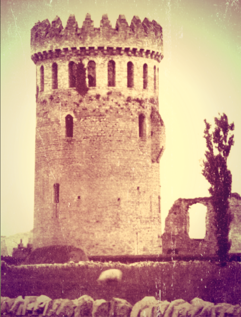 Painting based on contemporary sketches of the Donjon before the addition of the Victorian conceit.