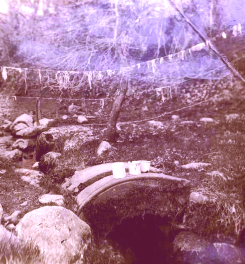 Two repurposed arches used as hand holds. There used to be an enamel mug on a chain for drinking the water but that has since disappeared. The water outflows to the side towards the nearby river
