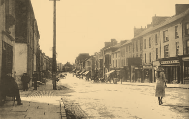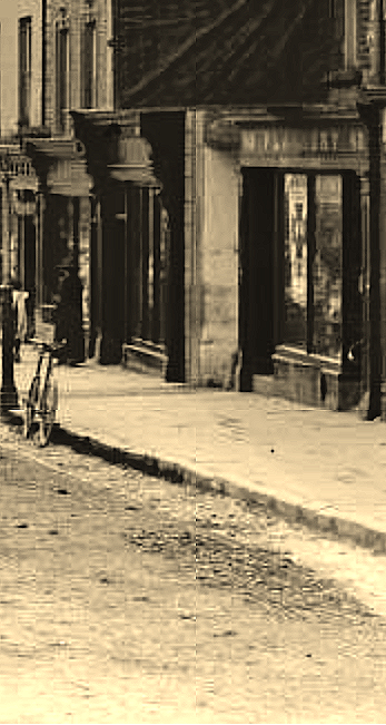A chap in a Bowler Hat and Jodhpurs walks down Castle St. Checking the National Bank at the Market Cross shows it has the previous Blind Pilaster from previous Architecture so this picture probably dates from 1900.