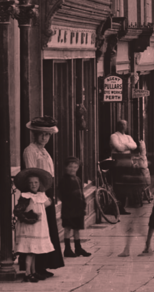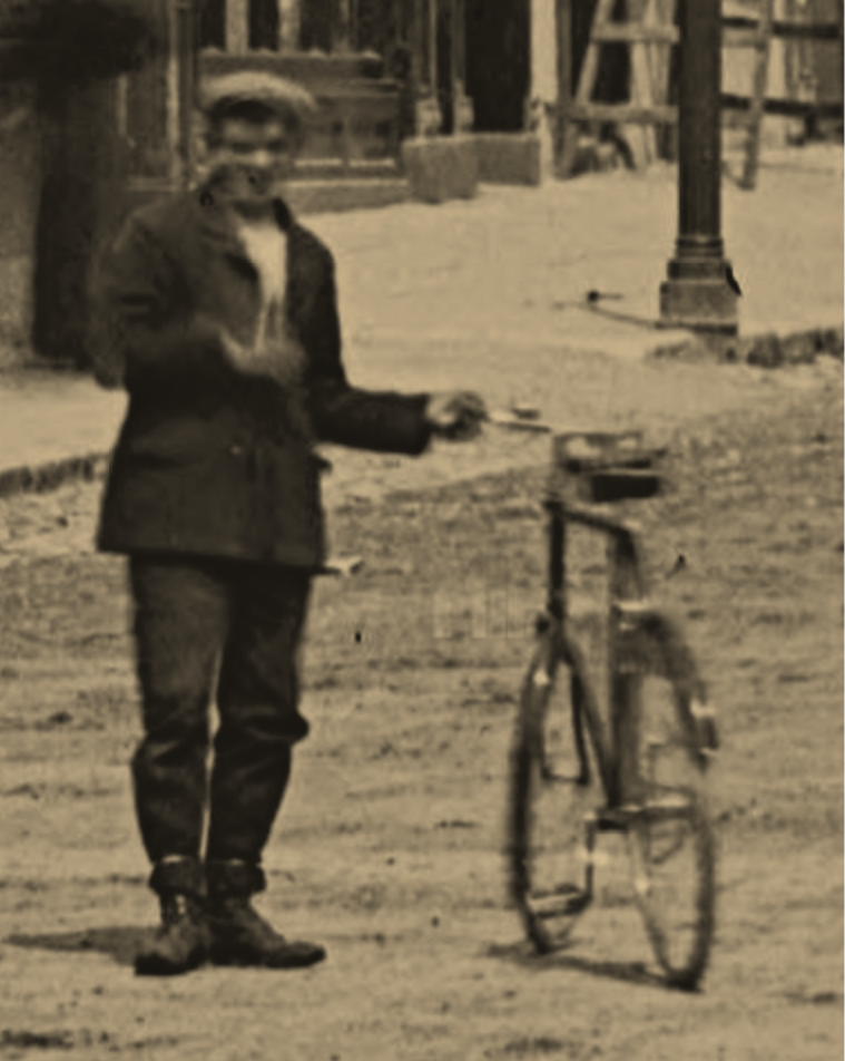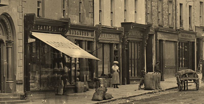 Across the road the shops go about their business. Harkness at No 46 offer Eley Shotgun Cartridges for sale. In the next two shops at 45 & 44, we have Jeremiah O’Brien selling Wine Spirits and Tobacco. Sandwiched between St Johns, Purveyor of Jewellery and Musicial Instruments at 42 and O’Briens, is Stephen Flannery’s Cycle Shop at 43. That dark rectangle overhead is an advert for Dunlop.