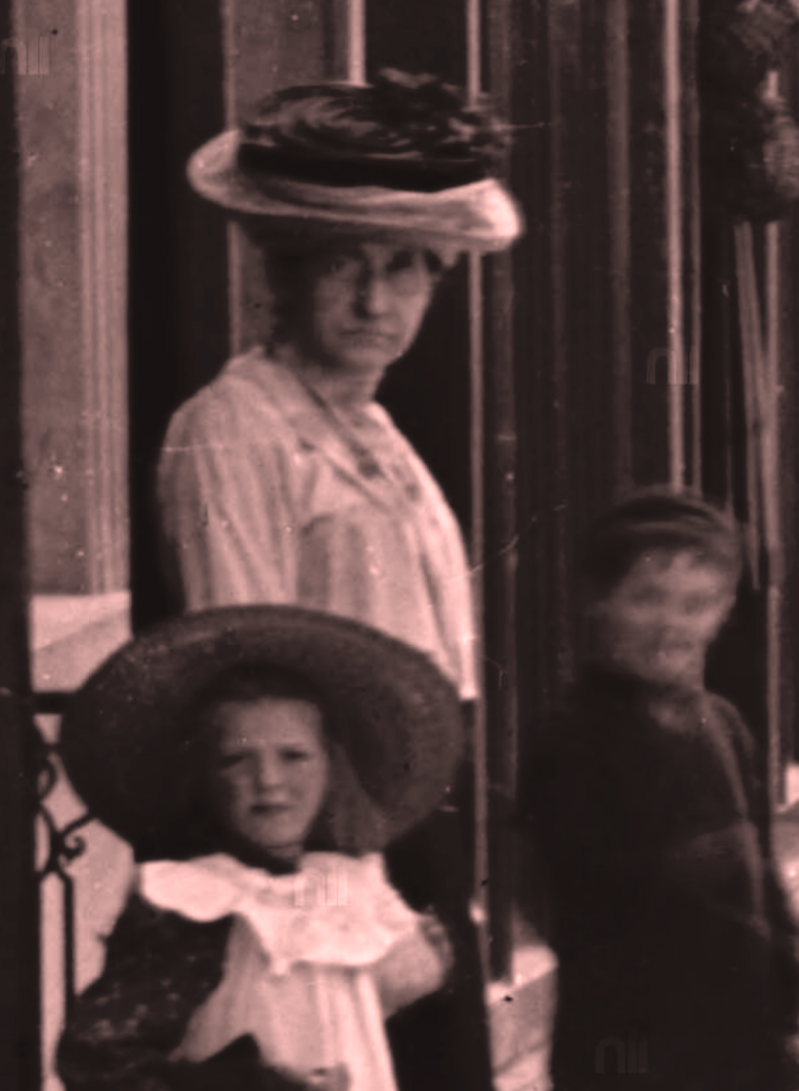 A bucolic Summers Day and a family group gather outside of Fred Days to watch the photographer go about his business. A man with a huge handle-bar moustache is the recently retired RGA RSM Michael Doran, from the Military Barracks who is now employed as a steward in the North Tipperary Club next door to Day's. His daughter Mary Agnes looks perfectly relaxed siting in one of Fred Day's deckchairs. Notice the open windows and the blinds drawn to prevent the sun bleaching the furniture.