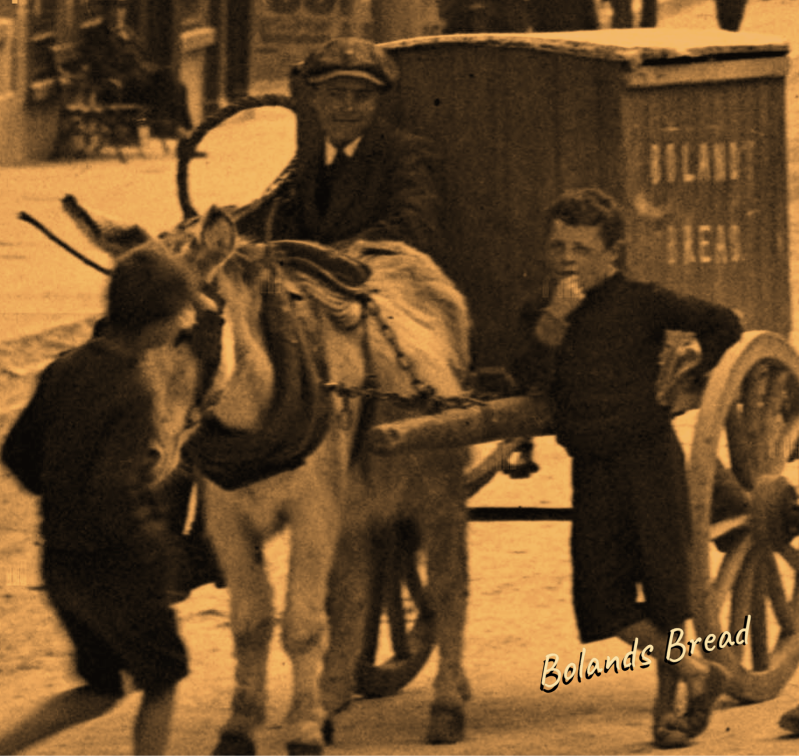 In this picture of Upper Castle St we have a chap on a Donkey and cart, delivering bread for Bolands Bakery. He has stopped to watch the photographer and his set-up. Some young lads, who obviously know him have stopped to chat. Maybe they’re related. Are they going or coming from school. Going I should think as it’s pointless delivering bread in the afternoon.