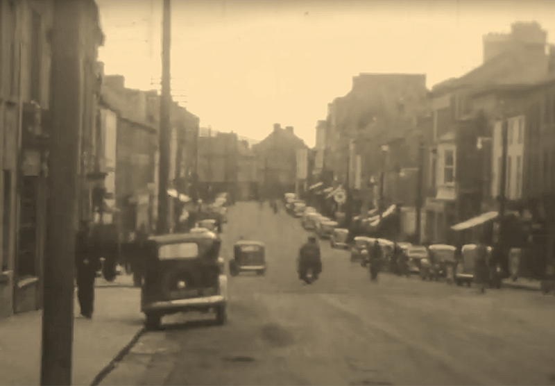 Some of the schoolboys have shoes, caps and a collar, carrying books under their arms. Some of the others have no footwear. A man stands to watch whilst another views all from his vantage point on a bench outside the Hibernian Hotel. We also have the pre-cursor for the bay window in what would later be J.K.C.’s. Behind this scene, we have a bunch of men sitting on the much lamented and missed Post Office steps, watching the world go by or perhaps putting it to right.